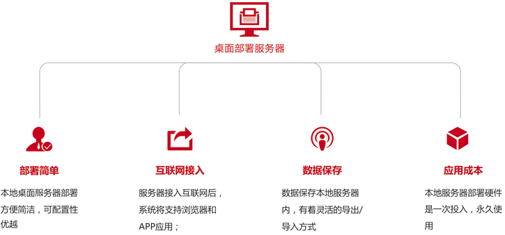 桌面服务器部署是指在用户在本地服务器安装管理软件系统,这是一传统的应用方式有着很高的可靠性,在接入互联网的情况下支持浏览器方式应用和APP方式应用,深受众多客户的欢迎,它的隐私保护及安全性具有很好的优势。